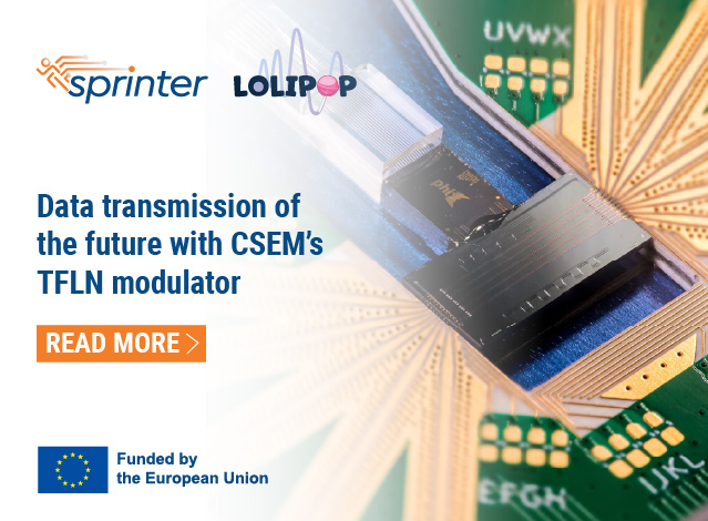 We’re proud to share that the joint work on Thin-Film Lithium Niobate (TFLN) modulators developed under the SPRINTER and LOLIPOP projects has been highlighted in CSEM’s 2024 Annual Report as one of the year’s key technological successes. These TFLN-based photonic modules are set to revolutionize data transmission, offering ultra-fast and energy-efficient performance for the next