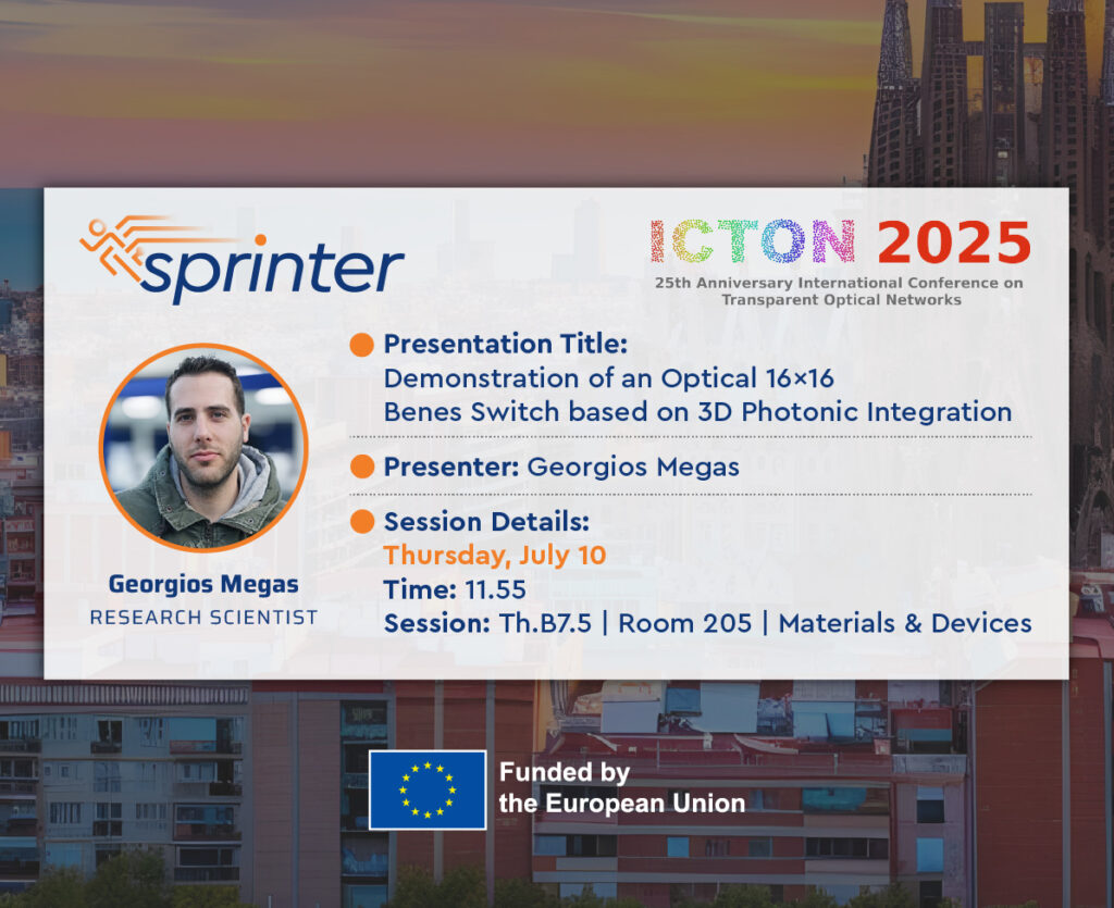 We are excited to announce that the SPRINTER project will participate in the 2025 25th Anniversary International Conference on Transparent Optical Networks (ICTON), one of the leading international events in the field of photonics and optical communication. 🔬 Presentation Title:Demonstration of an Optical 16×16 Benes Switch based on 3D Photonic Integration 📅 Session Details:Thursday, July